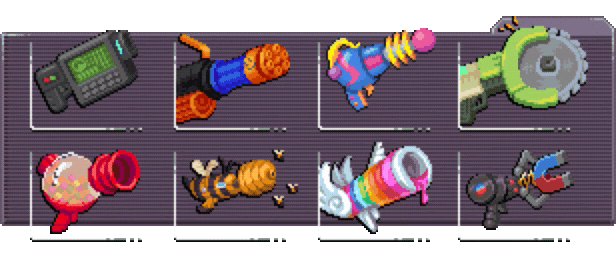 - Armas criativas como ketchup blaster, chiclete shooter, spray explosivo e outras ideias malucas